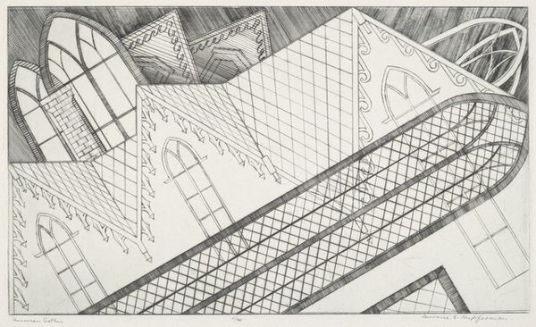 Ralston Crawford made this lithograph, Lobster Pots #1, using black ink to create a sense of depth and geometric abstraction. The approach to mark-making here feels considered, each line and shape carefully placed to build a composition that balances representation and pure form. It makes you think about art-making as a process, a way of seeing and understanding the world through deliberate actions. There's a real physicality to the lithograph. The contrast between the solid black lines and the soft, smudged areas of gray creates a dynamic surface. The texture invites you in, making you wonder about the tools used, maybe a combination of hard and soft implements. Look closely at the way the lines intersect and overlap, how the black ink catches the light differently in each area. It’s like a dance between control and chance. Crawford’s exploration of industrial and nautical themes connects him to other artists of his time, like Charles Sheeler, who were similarly drawn to the aesthetics of modern industry. These artists remind us that art isn't about fixed meanings, but ongoing conversations across time.