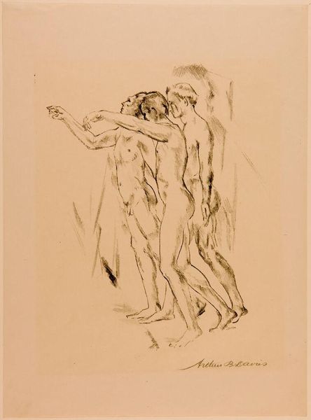 Editor: This watercolor drawing, titled "Chinese Boxers" from 1910, is by André Derain. The figures are loosely rendered, but there's a striking physicality present. What is it that catches your attention? Curator: Well, looking at this, I'm drawn to how Derain employed watercolor, typically viewed as a medium for landscapes and sketches, to depict these figures engaged in physical combat. There’s a real tension in using this traditionally "delicate" material to portray the "brute" force suggested by the title and subject. Do you see the contrast in the way the water color interacts with the figuration? Editor: Yes, I can see how that delicate medium challenges typical assumptions of artistic practice. Curator: Absolutely! Furthermore, this wasn't painted in China, right? It invites a reading of the West’s fascination with, and often misrepresentation of, non-Western cultures at the turn of the century, in order to extract and make it into something that sells. How were these bodies produced, displayed and ultimately consumed as entertainment for a largely western art market? It also makes me wonder about the colonial gaze embedded within such depictions. Do you consider these watercolors to be in support or to question the power dynamic between cultures? Editor: I hadn't considered the consumption of this artwork itself as part of the power dynamic. It's interesting to view Derain’s use of watercolor not just as a medium, but also as part of this bigger commentary on cross-cultural perception. I had viewed it as the artist just playing around with fauvism style to give it energy. Curator: Exactly! It shifts the conversation from just aesthetics to a material analysis rooted in cultural exchange and artistic production. The very act of creating this piece and circulating it speaks to colonial power structures. Editor: I see what you mean, it reframes my interpretation of the work. Thank you! Curator: My pleasure. Looking through the lens of materials helps us see a bigger picture, doesn’t it?