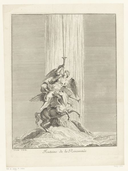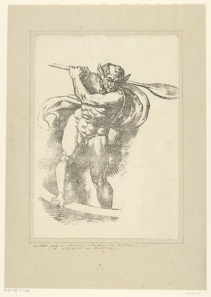 Honoré Daumier created this lithograph titled "Karikatuur van Daedalus en Icarus" in the 19th century. The scene is rendered in stark monochrome, where light and shadow define the forms and narrative. Our eyes are drawn to Daedalus in the foreground, his figure etched with deep, cross-hatched lines that convey both texture and emotion. The composition is structured around a visual contrast: the grounded, solid form of Daedalus versus the distant, falling figure of Icarus. Daumier uses the gaze of Daedalus, directed upwards through a telescope, to guide our eyes. The linear perspective, combined with the stark tonal range, enhances the dramatic tension. The fall of Icarus is a distant event. Daumier’s interest clearly lies in the psychological impact of the event on Daedalus, rather than the spectacle of Icarus's demise. This print is more than a retelling of myth, it's an investigation into human perception and the emotional weight of seeing, structured through the careful manipulation of line and form.