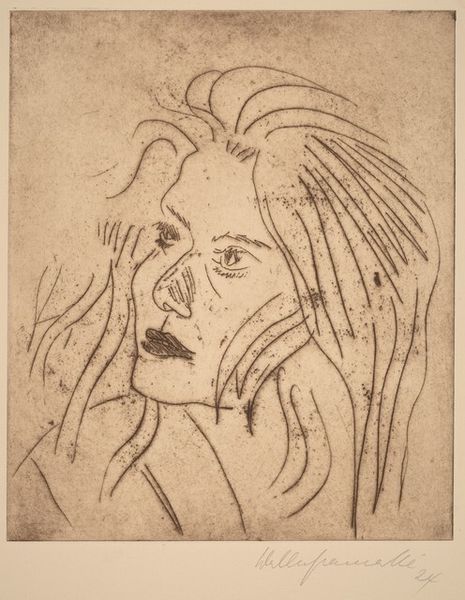 Editor: This somber drawing, "Marie-Thérèse Sad" by Julio Gonzalez, uses very simple lines. What catches my eye is the sense of deep sorrow conveyed with such minimal detail. What do you see in this piece? Curator: The face is a mask, yet it evokes the iconic representation of grief. Notice how the geometric shapes suggest both vulnerability and resilience. In what ways might the artist be inviting us to confront our own experiences of sorrow? Editor: It feels like a very personal and universal expression. It really made me think. Curator: Indeed, the power of symbols lies in their capacity to bridge the personal and the collective.