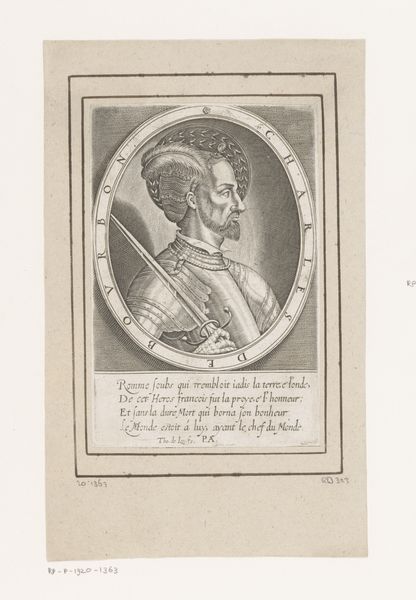 Editor: This is an engraving of "Portret van Giacomo da Barbiano" and is dated sometime between 1642 and 1704, by Georges Tasnière. There's something slightly comical about this depiction of a nobleman; what really stands out to me is how it seems to toe the line between reverence and a gentle mockery. How do you interpret this work? Curator: Well, the inherent politics of portraiture at the time, especially engravings, were deeply intertwined with power and status. While the Baroque style aimed for grandeur, consider how printed portraits like this served as a form of visual propaganda, disseminating the image and supposed virtues of the portrayed individual. Does this image convince you of the subject’s grandeur? Editor: Not entirely. His expression and pose seem rather self-conscious, especially within the elaborate frame. The contrast is rather striking. It makes him seem like a reluctant participant in his own glorification. Curator: Precisely. Now, look at the text beneath the portrait – listing his titles and affiliations. In your opinion, what role does the textual component play in solidifying, or perhaps undermining, his projected image? The politics of imagery goes well beyond appearance and aesthetic value. Editor: The text gives the image legitimacy but there's still a sort of playful tension, right? The 'Contrariis Grandior' at the top makes me think the artist may have included some social critique within the depiction, like they don't *fully* buy into the grand image being sold. Curator: A fascinating perspective. This piece prompts us to analyze who controlled the narrative, what messages were being conveyed, and how different audiences may have interpreted them, particularly when faced with art's role in portraying socio-political dynamics. Editor: That's given me a new way to see not only this piece, but other artworks in the gallery, and really think about their societal function, which I hadn’t considered before.