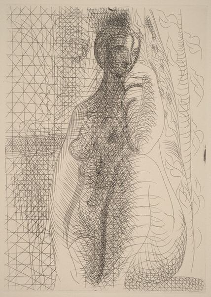 Editor: This drawing by Picasso, "Rembrandt Takes a Young Veiled Woman by the Hand," from 1934, is an interesting combination of linear precision and abstraction, made with ink on paper. It feels both classical and unsettling to me. How do you interpret this work, considering its historical context? Curator: This piece is part of a series Picasso created reflecting on artists of the past, especially Rembrandt. Picasso constantly positioned himself in relation to the canon, often using direct quotation or stylistic allusions to engage with art history and challenge it. This print series invites us to consider the museum's role, too. Whose stories are told and who gets to tell them? It plays with ideas of mastery and legacy, while simultaneously acknowledging the weight of tradition. Do you notice how Picasso has placed Rembrandt, rather than himself, within a recognizable artistic lineage? Editor: Yes, I see that! And the choice of Rembrandt seems significant given his mastery of portraiture and his own complex relationships. Is Picasso trying to align himself with that? Curator: Precisely! The "old master" discourse often operates to validate artistic genius, and Picasso certainly understood the power dynamics at play. We also need to remember this was the interwar period, with a growing fascination with psychology and biography that fueled interpretations of artists' personal lives through their art. In this context, these themes can be seen as elements through which Picasso renegotiated the definition of art. Editor: That’s fascinating. So it’s less about pure aesthetics and more about this dance with art history, ego, and cultural forces. Curator: Exactly. By examining its historical context, this simple line drawing turns out to be a meditation on legacy and the very idea of the artist’s persona. Editor: This reframing has really shifted how I see the work. Thanks! Curator: My pleasure. Context, after all, can unveil hidden conversations.