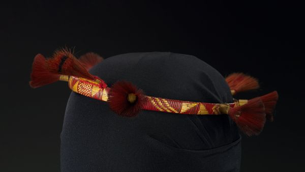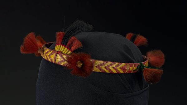 Curator: Our next piece is a "Woman's head band," dating back to around the 1970s. The band is attributed to the Sema Naga people, and it’s part of the Minneapolis Institute of Art collection. Editor: Well, my first impression is the dynamic contrast. The textures jump out immediately; there’s a clear interplay between the woven band and those bright, almost feathery tassels. It creates an interesting rhythm visually. Curator: Exactly. The formal construction relies heavily on the geometric repetition of woven patterns in warm tones contrasted with the punctuated bursts of red. It suggests careful attention to detail, employing techniques in textile work that showcase the culture's weaving practices. The semiotic layering of colour is not incidental. Editor: Agreed, but isn't the context equally crucial? Naga textile art often carries symbolic meanings, communicating social status, clan affiliation, or ceremonial roles within the community. How does this piece fit into that framework? Was this band for everyday wear, or something more specific, like a festival adornment? Curator: Good questions. While pinpointing its exact purpose without more specific ethnographic information is difficult, we can analyse the choices made regarding its creation. Note how the bright colours are used. Do they provide an intended contrast? Is there value in the visual weight of the tassels? Editor: I see what you mean. Thinking about who crafted this headband, the cultural implications for Naga women as artists is something to consider, especially during the 1970s. Curator: Certainly, thinking through who has the power to produce art helps understand a work's role and context in society. Editor: And it is interesting to look at a wearable piece in a collection outside of that original community context! I find myself now pondering how cultural objects from a community get displayed. Curator: Indeed. From a design and cultural view this head band makes me want to see the entire ensemble it could belong to. Editor: For me, thinking about the original community deepens its worth as a social and artistic artefact.