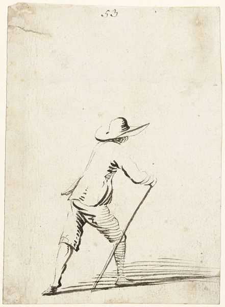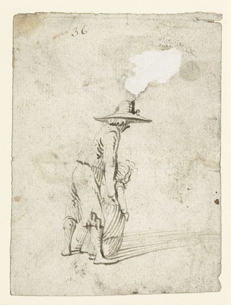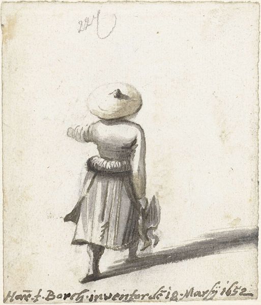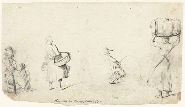 Editor: This is Harmen ter Borch’s “Woman with Scale and Man with Basket, From Behind,” made around 1650. It's a pencil drawing and really captures a specific moment in time. There’s something so everyday about it, yet also distant. How do you interpret this work? Curator: It's tempting to see this drawing as simply a genre scene, an unremarkable glimpse into 17th-century Dutch life. But I wonder, who are these people? What is their labor? Ter Borch’s choice to depict them from behind, anonymized and carrying the weight of their tasks, raises crucial questions about social class and labor within the Dutch Golden Age. Editor: So you’re saying it’s not just a snapshot, but maybe a statement? Curator: Precisely. Consider the Dutch Republic's booming economy fueled, in part, by colonial exploitation. How might this seemingly simple sketch reflect, perhaps unconsciously, the labor that underpinned that wealth? How does the composition itself—the backs turned, the suggestion of burdens carried—invite a reading about the lives of working people who often remained unseen? Editor: That gives me a lot to consider, it feels very relevant today! Curator: Absolutely! Art provides a mirror to society, both past and present. Analyzing ter Borch's choices invites a conversation about power dynamics, representation, and how we view those who perform essential labor even now. What do you take away from our discussion? Editor: That everyday images can still contain rich histories, and also tell an intersectional story. Thanks, that's very helpful.