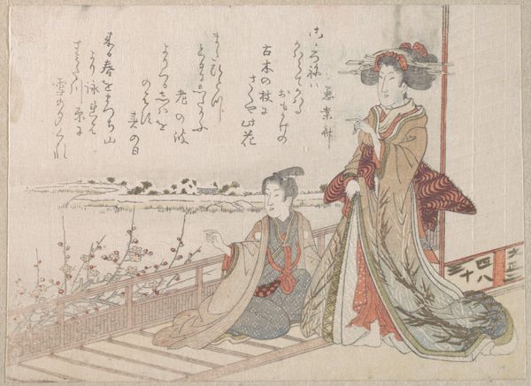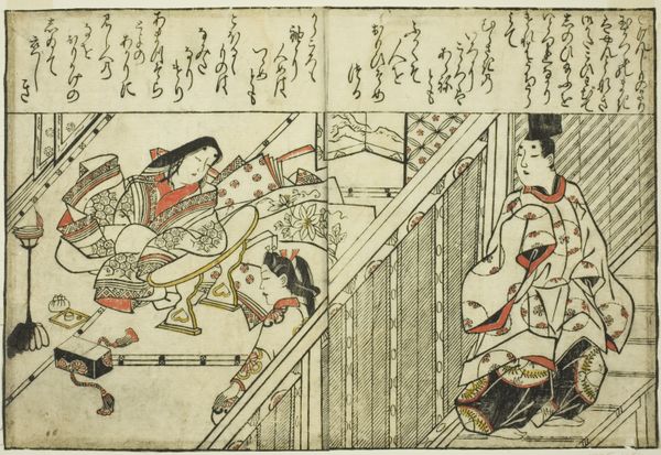 Curator: I'm struck by the way the artist, Hishikawa Moronobu, captures such a theatrical moment. This ink drawing, a print from around 1683, is titled "Shintokumaru Dancing before Oto Hime," pulled from his illustrated book, "Collection of Pictures of Beauties." Editor: There's a distinct feeling of courtly entertainment to it, a sense of watching a play unfold. The stylized figures almost float in their delineated space. Is that deliberate theatricality part of the broader tradition of Ukiyo-e? Curator: Absolutely. Ukiyo-e, meaning "pictures of the floating world," focused on ephemeral pleasures – courtesans, actors, entertainment. Moronobu was pivotal in establishing its distinct style, and that connection to theater, particularly the Kabuki tradition, is critical. Editor: It’s interesting you say that because the figure dancing holds a fan and pauses mid-gesture in such a suggestive way. He seems like the only one in the scene actually 'present.' But what about Oto Hime? Who is she in relation to the dancer, Shintokumaru? Curator: That's where it becomes interesting. Oto Hime is, in this case, positioned as the object of his performance, literally seated above as part of her court. By situating her in this way, it calls back to an old theatrical canon featuring these types of roles. This specific setup likely held a different charge in its original cultural context. Editor: The symbols around Oto Hime -- are those some kind of celestial emblems on the brocade before her? They seem intentionally arranged, almost iconic in their placement. Curator: Indeed, they echo a higher sphere of symbolic order befitting of her elevated status within the space depicted here. You’re right to consider their intent because they seem to be operating under very calculated motifs. As such, the tension lies not only in the exchange between figures but the symbolic context that they both uphold and defy at the same time. Editor: It is like a tapestry of symbols carefully arranged. It makes me think about the narratives and cultural performances it would have activated at the time. Thank you for revealing this for me. Curator: And thank you for seeing the intricacies within! Thinking about Ukiyo-e as carefully mediated social commentary certainly enriches our reading of works like these.