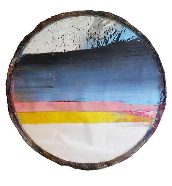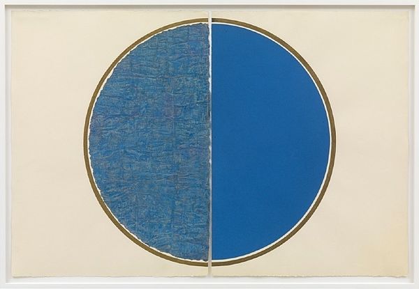 Davey’s sculpture in the late 1980s was preoccupied with circularity and pairing. Although abstract, the informal positioning and steel lips of the circles suggest the lids of vats, or giant paint pots, momentarily set to one side. By subtly altering the geometry of the circle Davey subverts notions of ideal beauty and uniformity. The streaked surface of the two parts of Ce & Ce, with its traces of poured acid, underscores this subversion of purity. The title suggests a visual pun about looking at a work in which one element partially eclipses the other behind it. Gallery label, February 2011