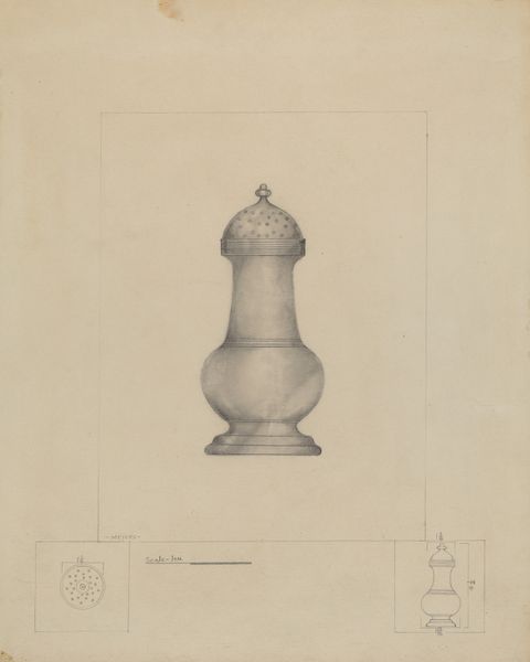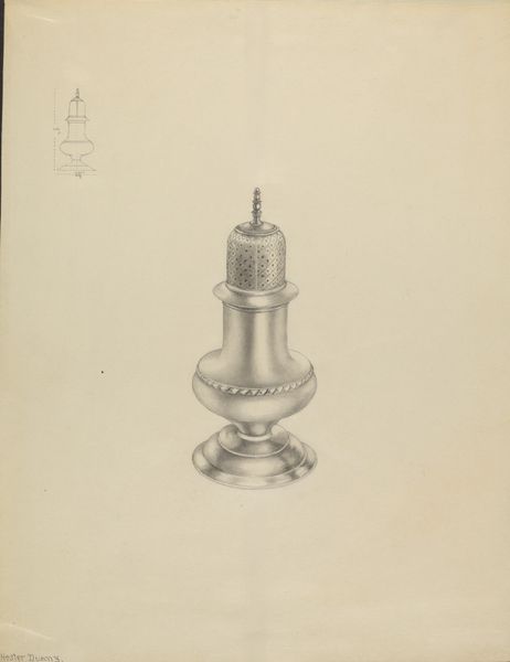 Herbert Russin made this drawing of a Silver Caster with graphite on paper. What strikes me is the soft, gray scale he coaxes from this humble medium, almost like he’s trying to hold a memory in pencil. Looking closely, the graphite isn’t applied evenly; it's built up in layers to capture the form and light, creating this wonderful sense of depth. You can almost feel the cool smoothness of the silver and imagine picking it up. I particularly love the upper, perforated section of the caster, where the light catches ever so slightly, suggesting a delicate, shimmering quality. It’s as though Russin wanted to preserve not just its appearance but its essence. This reminds me of Morandi’s still lifes where everyday objects become profound through careful observation and rendering. Like Morandi, Russin shows us how seeing is really about slowing down and imbuing the ordinary with extraordinary attention.