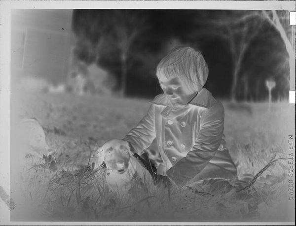 Curator: This is an untitled photograph, believed to be created by Lucian and Mary Brown. The image, at the Harvard Art Museums, features a boy holding puppies. It's quite small, only about 4x3 inches. Editor: It's striking how the tonal inversions give it a dreamlike quality. The boy almost seems to be cradling clouds, not living things. Curator: The symbolism of youth coupled with animals often speaks to innocence, hope, and the promise of new beginnings. The photograph captures an intimate moment, a quiet connection between the boy and the puppies. Editor: I wonder about the printing process itself. This looks like a negative, emphasizing the materiality of photographic creation. Did they meticulously choose paper stock to get these effects? Curator: Perhaps the stark reversal adds a layer, making us consider themes of duality—light and shadow, innocence and the unknown. Editor: It's a simple scene, but the material treatment transforms it into something quite evocative. I'd love to know more about the choices behind that process. Curator: Ultimately, this image invites us to reflect on the enduring power of connection and the ephemeral nature of memory. Editor: An interesting play between the everyday and the ethereal, crafted with intent.