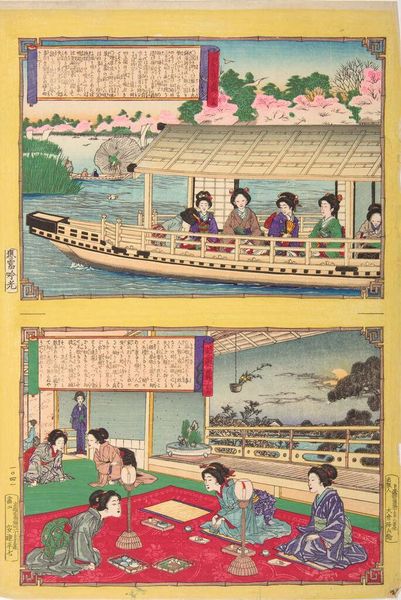 Editor: This is Adachi Ginkō's "Rules for the Department of Young Ladies," a colorful woodblock print. The scenes feel very formal and staged. What can you tell me about the social context of this piece? Curator: Well, the title itself points to a very specific social agenda. How does the depiction of women in the image, their posture, attire, and activities, reinforce or perhaps subtly challenge the expectations of women at the time? Editor: I see women learning etiquette, it appears. It feels very restrictive. Curator: Precisely. Consider how these "rules" functioned within Meiji-era Japan, impacting women's roles and opportunities. Does the artist's style convey any implicit critique of these societal constraints? Editor: I hadn’t thought of it that way. It makes you wonder if the artist felt conflicted about these rules. Curator: Exactly! Art often operates in this space of tension, reflecting and questioning societal norms.