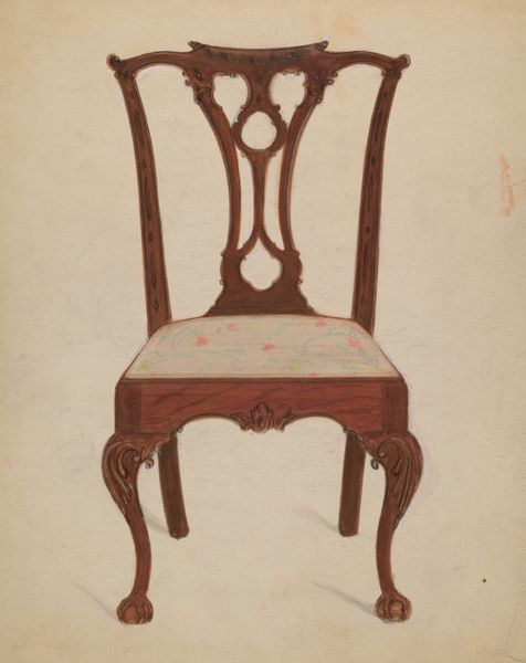 Florence Truelson made this drawing of a Queen Anne Chair, likely around the 1930s, using graphite and colored pencil. The velvety texture of the upholstered seat and back is beautifully rendered, yet the lines of the drawing remain crisp and technical. Truelson has highlighted the chair’s carved wooden elements. Notice the cabriole legs, ending in pad feet. These kinds of details evoke a sense of luxury and refinement. But the drawing also shows the chair's construction, the way the frame supports the plush surfaces. It's clear that skilled labor went into both the making of the chair itself, and into Truelson's record of it. We can see how a piece of furniture, so often considered either a purely functional object or a symbol of status, can also be understood as a product of design, and the skilled trades that make design possible. Truelson's drawing makes us think about the relationship between art, craft, and industry.