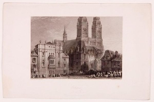 Curator: This piece, "Marketplace at Haarlem, Looking towards the Town Hall," painted on wood by Jan ten Compe between 1728 and 1761, presents a vibrant depiction of Dutch civic life. The canvas, currently held at the SMK, offers a window into the social dynamics of Haarlem. Editor: My first impression is one of restrained elegance. The monochromatic palette imparts a serene quality to the bustling market square. The buildings are depicted with remarkable detail, considering the reductive chromaticism. Curator: Indeed. The lack of color directs our attention to the compositional elements and the depiction of social interactions within the marketplace. Note how Compe rendered the various social strata through clothing and activity – observing who is selling what, who is buying, who simply strolls for leisure, all hinting at the complex economic strata within Dutch society at the time. The town hall itself serves as a backdrop, but more than that it’s the reason, I believe, for this depiction of everyday exchange. Editor: The spatial organization is also crucial. Compe uses perspective masterfully to guide the eye towards the Town Hall, creating a visual hierarchy. The sky, taking up so much of the composition, enhances this effect, providing atmospheric depth. Look at the precise architectural articulation against the broad, almost abstract sweep of the clouds, it makes you think about Dutch interior paintings somehow. Curator: Let's consider the materiality too. Painted on wood, this cityscape is not simply an image; it’s a crafted object. The very act of painting such a detailed scene on a wooden panel speaks to the prevailing guild structures, as well as artistic economies of the time, doesn’t it? How images, objects, artistic skill were not necessarily the realm of individual endeavor but communal cultural identity. Editor: Yes, you are right. Analyzing the form shows this work exists in dialogue with established aesthetic conventions of landscape and genre paintings, particularly in its attention to light and its concern with visual clarity. Compe meticulously employs the structure, but simultaneously, something vital is lost in that strict adherence. Curator: Precisely! Through Compe's painting, we grasp a richer comprehension of the socio-economic elements structuring everyday life, beyond just appreciating optical brilliance. Editor: For me, the enduring strength of the piece resides in its capacity to blend meticulous structural arrangement with spontaneous observations on the atmospheric condition of a town square in the midst of transformation.
