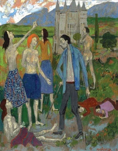 Curator: Before us, we have "Scene paysanne," a pastel painting by Grégoire Michonze. What are your initial thoughts? Editor: I'm immediately struck by the slightly unsettling, dreamlike quality. The muted palette and the somewhat awkward figuration contribute to a feeling that something isn't quite right, but also very intriguing. Curator: It’s fascinating how Michonze manipulates perspective, compressing space and almost flattening the figures. Observe how he uses colour—the blues and reds—to define form but also create these intriguing tonal relationships. It's as if the colour exists independently of the subject matter. Editor: Indeed. And that bird in the tree, and the peculiar expression on that goat – aren’t animals often symbols of fertility and instinct? The landscape as well; it has echoes of Arcadia, an idealized nature. Perhaps Michonze is subtly exploring our relationship with nature and primal desires. Curator: Perhaps, but consider the picture plane as a deliberate arrangement of shapes and textures. Michonze's gestural marks build up this intricate surface, an almost self-conscious display of painterly process. Editor: The grouping of the women certainly carries symbolic weight. Is that one woman protecting the standing one? And the figure lying in the field gesturing with apparent adoration—could the relationship be interpreted through classical mythological figures, as in Diana and her nymphs? Curator: Your reading invites narrative, of course, and mythology serves as a cultural mirror. Yet, it's vital that we return to the visual evidence: the repeated horizontals and verticals, the counterpoint of warm and cool colours... Michonze may not intend clear storytelling at all. Instead, the painting enacts pictorial tensions. Editor: A delicate balance between representation and something much more subjective, psychological even. I keep circling back to those animals – they add a folkloric, magical air to the scene. Curator: Precisely, so what seems like bucolic simplicity reveals itself as carefully orchestrated disharmony. Editor: Michonze provokes with unresolved narrative and uneasy composition to activate deeper resonances in us. Curator: Leaving us to consider if we truly understand how appearances and underlying meanings converge.