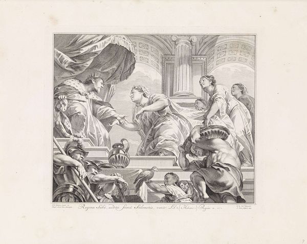 Jan Punt created this print, "King Ahasuerus Reaching His Golden Scepter to Esther," using etching and burin. The composition is dominated by the sharp lines and geometric precision of its diamond shape, offering a structured view of the biblical scene. The narrative unfolds on a stage-like setting, where the characters' gestures and postures communicate their roles and emotions. King Ahasuerus extends his scepter, a symbol of power and clemency, towards Esther, who leans back collapsing, while the figures around them react with concern. The artist uses perspective to create depth, drawing the viewer's eye from the foreground figures to the architectural elements in the background. The diamond shape could be seen as destabilizing traditional, rectangular formats, suggesting that the artist is challenging fixed meanings, inviting viewers to engage in new ways of seeing and interpreting this classic story.