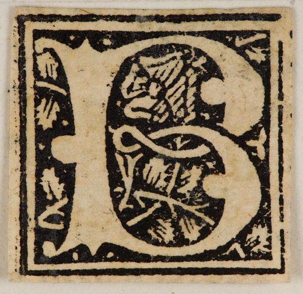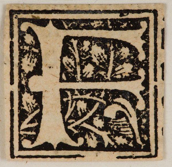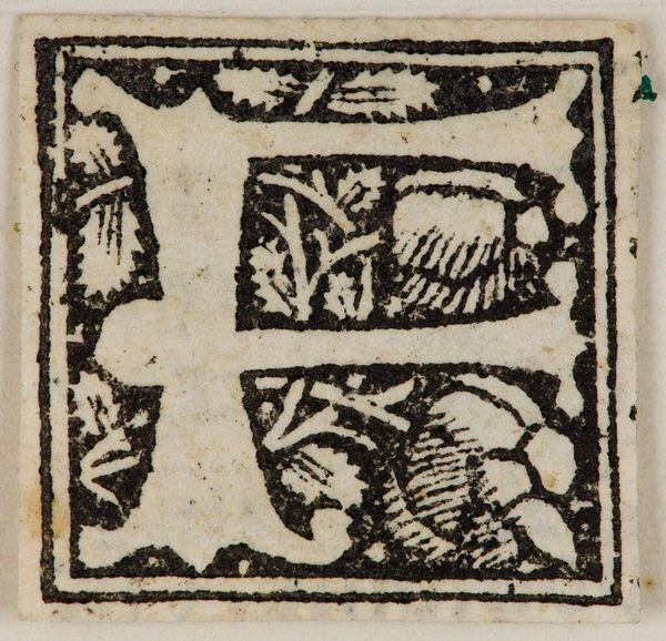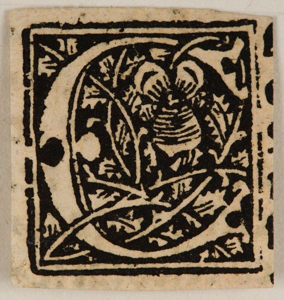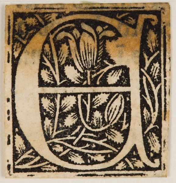 Curator: Let's consider this woodcut print, titled "Initial G," created by an anonymous artist. Immediately, what feelings does it evoke? Editor: Intimacy and age. It's such a small, contained world, yet it hints at something much larger. It feels almost… primal, like an ancient seed. Curator: Yes, the letter is stylized with intertwining vines and leaves, a visual language deeply rooted in illuminated manuscripts and the natural world. The “G” itself becomes a vessel. Editor: It certainly does. Consider the visual weight of the flora contained within the letterform. In illuminated letters, the initial can be a portal into a narrative. Curator: Exactly, and the black and white contrast lends it a dramatic intensity, almost as if the artist is pulling secrets from the darkness. A small but impactful piece. Editor: It whispers, doesn't it? I like that. I'll be thinking about that small world.