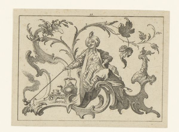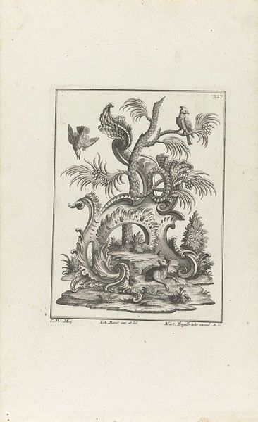 This print, "Hoorn des overvloeds waaruit drie konijnen te voorschijn komen," was made by Christoph Jamnitzer in the late 16th or early 17th century using etching. The crisp lines and delicate shading speak to the alchemic process of acid biting into a metal plate. It is a precise method demanding expertise, and no small amount of physical labor. Notice the intricate details of the cornucopia, overflowing with foliage and rabbits, supported by two figures. Jamnitzer masterfully uses the graphic potential of the etched line to create a sense of depth and texture. The etcher's art transforms base materials, like copper, into something refined and valuable, and points to the commercial opportunities of the era. This print underscores the importance of technical skill in the creation of art, blurring the lines between craft and fine art. The abundance depicted, ironically, depended on the labor involved in the printmaking process itself.