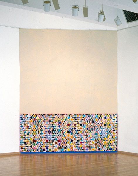 Curator: Here we have "Imprints of a No. 50 Paintbrush Repeated at Regular Intervals of 30 cm.," a 1968 mixed media installation by Niele Toroni. Editor: My first thought is that it’s surprisingly serene. There’s something meditative about that repeating, almost rhythmic pattern of red dots marching across the surface. Curator: Indeed. Toroni’s work challenges conventional ideas about artistic expression. By utilizing a consistent, repetitive gesture, he’s questioning the authorial presence so central to the art market and artistic reputation. Editor: I see what you mean. The repetitive mark acts almost as a kind of visual mantra. Is the No. 50 brush just a tool then, without emotional weight in itself? Curator: Exactly! The uniformity undermines any sense of personal style, placing emphasis on the systemic nature of artistic creation, almost a bureaucratic approach to art making. This was his core focus, really, divorcing art from self expression. Editor: It also hints at industrialization—the idea of the machine-made object. Although those dots are imperfect, you can sense some loss of humanity with a regular repetition, such as in wallpaper or industrial labels. Yet, there’s also something primal about the circle, an archetypal form with many interpretations from a mandala, the sun, or even cellular division. Curator: A fruitful suggestion, it may very well represent something on that conceptual border. This approach does speak to minimalism’s broader critique of consumerism and the objecthood of art, as it moves into seriality and an industrial aesthetic. Toroni's process makes the gallery itself as a backdrop. Editor: So the impact is less about the dots themselves and more about this calculated placement and negative space? Curator: Precisely. It invites us to think about institutional presentation. By extending the painted surface from the wall onto the floor, it disrupts the assumed boundaries of the artwork. Editor: I find I’m left pondering what “art” truly is, where it starts, and where it ends—in the studio, in the gallery, in the observer's eye? Curator: And that, I suspect, is precisely what Toroni aimed to provoke. A demystification of artistic creation and its display.