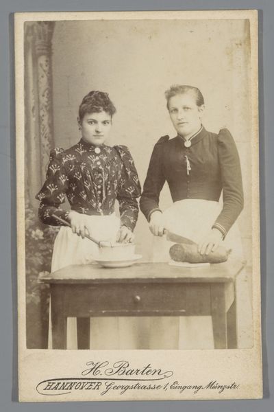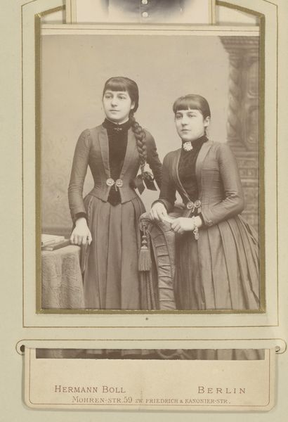 This mounted albumen print titled 'Portret van Ch.A. Matthes-Doorman en een vrouw' was created by Albert Greiner. This portrait offers a window into the complex social constructs of gender and class in the late 19th century. The women’s fashion, from their feathered hats down to their beaded embellishments, speaks to a certain level of affluence, reflecting the rigid social hierarchies of the time. Their reserved poses and direct gazes are fascinating. Are we seeing a carefully constructed performance of femininity, or are there glimmers of individuality breaking through? What I find striking here is how the photograph invites us to consider the tension between representation and reality. While seemingly traditional, these women subtly challenge conventional narratives, inviting us to question the roles they inhabit. The print, in its delicate tones, captures a moment of quiet defiance, a subtle disruption of societal expectations.