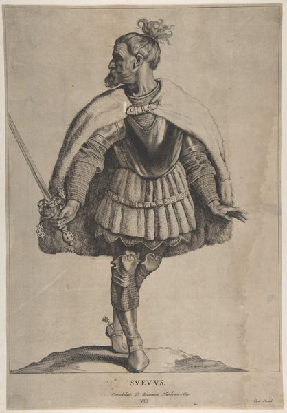 This double-sided woodcut, created around the mid-16th century by Christoph Weiditz, features portraits of Herr Conradt Mair and Herr Hanns Paulus Herwardt. Notice how the linear precision and intricate detailing shape the figures, capturing both their likeness and status. The texture, achieved through delicate cuts in the woodblock, enriches the composition. The figures stand proudly beside their heraldic shields; these elements are not mere decoration but function as semiotic markers, communicating lineage, values, and social standing. The symmetry and balance of the composition create a sense of order, yet the elaborate ornamentation suggests a destabilization of established meanings. Consider how the formal structure of the woodcut serves as a cultural artifact. It reflects the era's emphasis on identity and legacy. This artwork challenges fixed meanings by engaging viewers in a complex dialogue about representation, power, and the semiotics of heraldry, inviting ongoing interpretation.