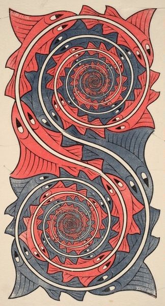 Editor: This is Nicholas Krushenick's "James Bond Meets Pussy Galore" from 1965, using acrylic paint. The title is definitely provocative! The bold colours and lines really vibrate. It’s kind of dizzying actually. What compositional elements stand out to you most? Curator: Initially, one is struck by the stark delineation of form. Note the unmodulated fields of colour bordered by assertive black lines. These contours establish discrete shapes and obviate any sense of depth, reducing the composition to a plane. How do the colours themselves affect your perception? Editor: The bright red, yellow, and purple feel very energetic, almost like they're clashing, yet somehow harmonious. They don't blend at all; it's all about contrast. Curator: Precisely. The artist deploys colour not as a means of representation but as an independent formal element, a device to activate the surface and to create visual tension. Observe the dynamic interplay between the curvilinear forms and the sharp, angular "leaves." What structural relationships can you identify? Editor: I see how the curved lines create a kind of rhythm, while the sharp angles introduce a disruptive element. It's almost like a visual argument! Does this create visual stability, instability, or a bit of both? Curator: A calculated instability, I would posit. The composition resists easy resolution, preventing the eye from settling into a passive mode of spectatorship. The hard edge painting and jarring palette challenge our sense of equilibrium. The artist's emphasis is on optical sensation over mimetic representation. Editor: I see what you mean. I went in expecting a narrative about James Bond but came out realizing the focus is all on the experience of seeing itself. Curator: Indeed. The title offers a point of departure, but the work’s significance resides in its manipulation of visual syntax. The title acts more like a wink and a nudge than any clear visual descriptor. The interplay of color and line creates an experience greater than just a picture of Bond meeting Pussy Galore. Editor: That’s a good point. Focusing on form helps us see the title as another tool within the artwork, just another layer of meaning and perception, and not something literal.