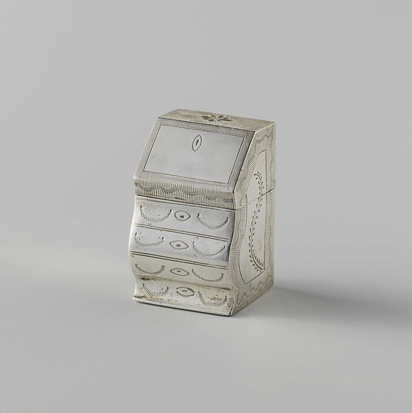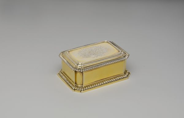 Curator: What a charming object. We're looking at a porcelain and metal snuffbox created sometime between 1739 and 1755 by the workshop of Charles Fromery. Its delicate size immediately grabs my attention. What do you think? Editor: There's a sort of restrained opulence to it. The gold against the white gives it a clean look, but it also hints at the decadence associated with snuff consumption back then. Curator: Precisely. Snuffboxes like this weren't merely functional; they were status symbols. They circulated in spaces and created networks where elites gathered. Think of the ritual involved—the offering, the taking, the societal expectations—all mediated by this small, gilded box. Editor: And that central motif on the lid - it seems to me like some kind of heraldic crest, perhaps subtly referencing the owner's family lineage. It's more than mere decoration. Curator: The Rococo style, known for its ornamentation and asymmetrical designs, played a significant role in shaping perceptions of gender and power dynamics, particularly within aristocratic circles. These decorative elements reinforced traditional social hierarchies. Editor: Right, the craftsmanship alone broadcasts privilege. Imagine the number of hands involved, the specialist knowledge… but I also see the inherent irony. Taking snuff was about pleasure, but this ornate object signifies constraints, right? You’re always on show; status comes with performance. Curator: Absolutely. The snuffbox is not just a pretty object; it encapsulates broader cultural issues. These types of miniature sculptures serve as important reflections of that era, inviting questions about class, power, and social identity. Editor: Looking at the little festoons repeated on its sides, it reminds me how potent visual cues were for constructing and communicating selfhood back then, even through seemingly trivial accessories. Curator: Indeed, it’s quite telling how a small, ornate object can reveal complex facets of historical existence. Editor: Exactly, sometimes the most precious objects hold the richest cultural clues.