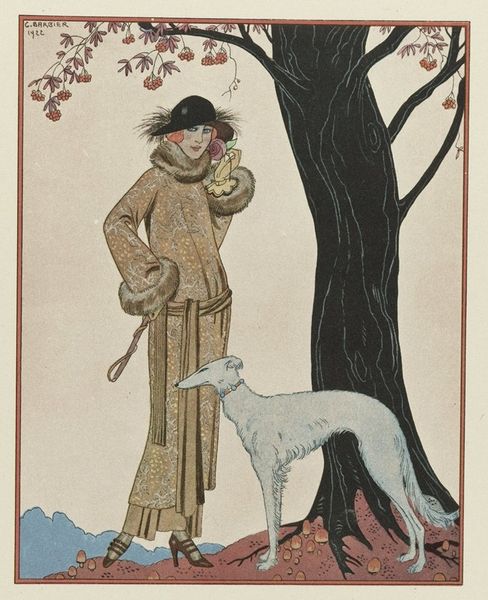 Editor: This watercolor, “Le Belvédère; Robe-Manteau, de Worth” by George Barbier, was completed in 1924. I'm really drawn to the fashion – especially the coat, but the building in the background is odd; almost like a stage prop. What do you make of the setting and its relationship to the figure? Curator: The 'set' is incredibly relevant. Barbier worked during the Art Deco movement, a period where fashion and social status were deeply intertwined, particularly in depictions of women. This watercolor is an explicit representation of aspiration and consumer culture, emphasizing the lifestyle that the Worth design embodies. Editor: How so? Is it about wealth? Curator: Partly. It is a visualization of modern womanhood as defined by the upper classes and haute couture; Barbier was explicit in using fashion to frame the modern social landscape. What appears artificial in the setting reinforces the aspirational messaging within the artwork itself, placing it as both social commentary and commercial image. Who did Worth design for at this time? Editor: If I remember correctly, Worth catered to European royalty, celebrities, and socialites. So, access to Worth defined social status. Curator: Exactly. This watercolour wouldn't be out of place within advertising campaigns because its central motif is luxury and aspiration, highlighting art's role in constructing desire and normalizing wealth. Editor: So, it’s more than just a pretty picture. I see that the artist uses fashion as a short cut to describing a socio-economic class, reflecting larger political and economic structures. Curator: Precisely. Next time you see a fashion plate, consider how the art may comment on societal values of the day.