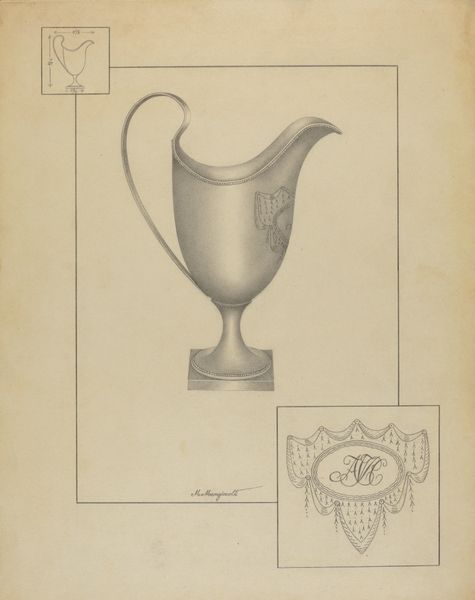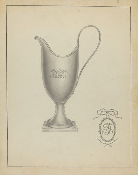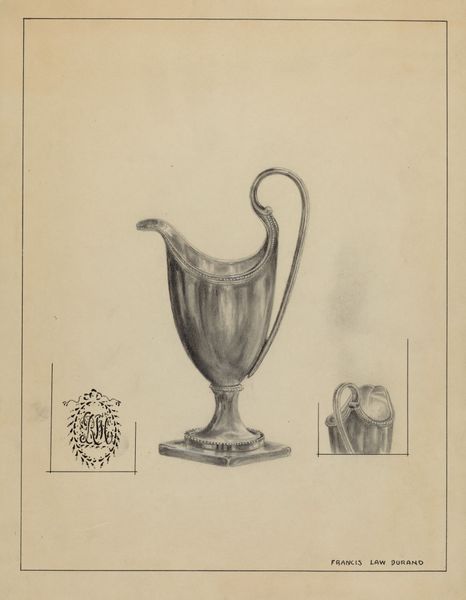 Curator: The Francisco Alvarez pencil drawing, "Silver Creamer," dated 1936, offers us a remarkably detailed study. The realism captures not only the form, but also hints at the play of light on polished silver. Editor: It has a quiet grace, doesn’t it? Almost hushed. The precision of the lines feels deliberate, as if the artist were reverently tracing the curves of something precious. The tiny rendering in the corner almost adds a functional vibe to it, like this could have been a sketch for design, or… Curator: Precisely. The object, a silver creamer, would typically carry associations of refinement, domesticity, perhaps even a certain social standing, especially when graced with engraved embellishments. In this case it features stylized heraldic devices or a monogram—markers of identity, lineage and belonging. What strikes you about its portrayal here? Editor: Well, it’s rendered with such tenderness! The almost photographic detail pulls you in, so much more compelling than some splashy portrait. It's more than just showing what something looked like, there’s a tangible depth and dimension. I can almost feel the cool, smooth surface, imagine the weight of the vessel in my hand. Curator: Alvarez uses pencil, traditionally a medium for preparatory sketches. The fact that the artist dedicates this level of detail hints at more than just function. Consider what a humble, quotidian object becomes, viewed through the lens of modernist ideals of design and function elevated through sheer skill and detailed observation. Editor: Absolutely. I was about to say that it even touches a nerve… It evokes a specific time period without being didactic about it. If it wasn't silver, and you painted it white, it could have come from Ancient Greece... Maybe that feeling arises because silver is intrinsically tied to light, almost echoing a sense of spiritual clarity… What was the intended message? A status symbol, or the soul of silver? Curator: Indeed. In its original context, a silver creamer represents so many things: wealth, sophistication, perhaps aspiration. Through meticulous drawing, Alvarez reframes our perspective, inviting us to truly *see* its intrinsic elegance. We consider that context today, and all these possibilities expand again, beyond their conventional associations. Editor: Hmm… food for thought, absolutely. This creamer… the humble graphite, both contain a peculiar shimmer, which somehow stays with you long after you stop looking.