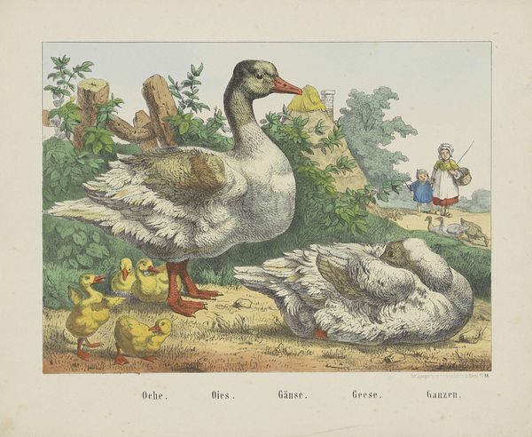 Curator: Let's consider this delightful print held here at the Rijksmuseum. It’s called “Faisans,” “Fasanen,” or simply “Pheasants,” depending on your language, crafted by the firm Joseph Scholz sometime between 1829 and 1880. The image appears to be a watercolor print depicting a family of pheasants. Editor: My first impression is of charming domesticity—the close-knit arrangement of the pheasant family creates a sense of warmth, of being encompassed and safe. Curator: Yes, there is definitely an intentionality to it, a visual commentary on familial harmony which speaks to broader social values during the period in which it was created. You see such sentiments being woven into many different types of visual arts from this time. Editor: I see it especially in the arrangement of colours. The golden hue of the chicks, contrasted against the cooler greens of the foliage, adds a subtle sense of liveliness to what might have otherwise felt static. It keeps the eye moving within the frame. Curator: Absolutely. Consider also that this print likely served a didactic purpose beyond mere aesthetic enjoyment. Prints such as these would often have been used for educational purposes, helping to foster an understanding of the natural world but always reflective of human impact on our broader cultural and socio-political environments. Editor: I am also drawn to the stark difference in texture between the detailed plumage of the adult pheasants and the downy softness suggested in the chicks. It’s very cleverly done using the watercolor. It is very detailed and illustrative! Curator: Exactly! And what you may find fascinating is to explore how popular imagery, often circulated through affordable prints like these, informed and reinforced contemporary attitudes about nature. What do we value and want to emulate? Where are the societal divides represented by which creatures and in what arrangement. Editor: The subtle way they play with texture helps them represent a rich narrative within a very constrained space. Curator: I’d agree. Scholz gives us an echo of natural beauty while mirroring the values held in wider society, all framed within a digestible image designed for wide distribution and absorption. Editor: It is hard to argue with such accessibility. Now I have much to ponder from simply looking at a group of birds.