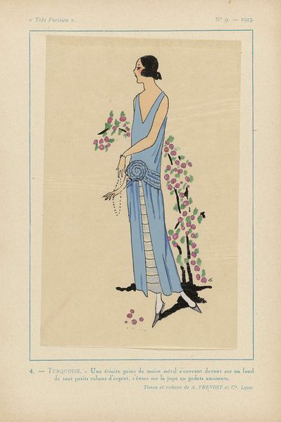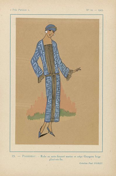 Curator: Before us is "Trés Parisien, 1923, No. 2: Tissus de chez MATHIEU...Fantaisie Orientale", a print drawing created by G-P. Joumard, currently held in the Rijksmuseum collection. Editor: My immediate reaction? It's a playful yet sophisticated study in contrasts. The textures jump out—matte paper versus the implied sheen of the fabrics. Curator: Precisely! Let's consider the interplay of line and color. The bold outlines defining the figure are countered by the soft washes of color, characteristic of Art Deco illustration. Note how the diagonal stripes of the top draw the eye upward. Editor: And what about the historical context? This was published in 1923. Fashion illustrations like these reflected and shaped Parisian style at the time. "Oriental fantasy" tapped into popular fascination with exoticism during the interwar years. We see it manifest with that blindfold headwear. Curator: Absolutely. Joumard employs what we could term 'soft constructivism,' arranging geometric forms to suggest a sense of movement and dynamism despite the flat picture plane. This interplay underscores the tension between representation and abstraction so fundamental to Art Deco. Editor: Also, think of where it might have been consumed, initially. Was it aimed at tailors, wealthy clients, or pattern-makers who had to reproduce these items? This helps us think about who participated in shaping fashion’s social and visual appeal during this period. Curator: Good point. One might ponder about its visual relationship between print as commodity versus art object, how the clean lines convey a modernist, forward-looking vision, while elements like the elaborate bows gesture to older, more ornate traditions. Editor: Indeed, analyzing the artwork in this context is enlightening. Considering how an elite fantasy around othered cultures fed Western design helps illuminate deeper aesthetic structures and values from the period. Curator: In closing, examining Joumard's piece reveals how stylistic tensions reveal something lasting, with elements of Art Deco and Orientalist aesthetic codes that have persisted and mutated. Editor: To further explore these ideas with artwork, please find the list of suggested stops related to textiles, fashion and early modernism on your audio guide.