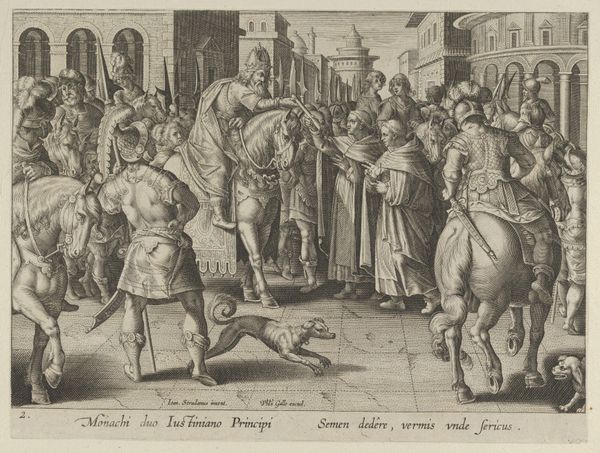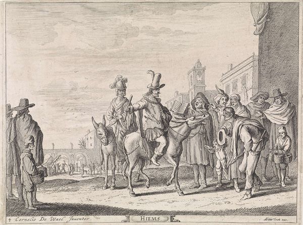 Curator: Here we have Wenceslaus Hollar's engraving, "The Meeting of Turnus and Camilla," created in 1654. What strikes you first about this print? Editor: The precision! And, I confess, the palpable tension. All those figures meticulously rendered, but locked in a frozen tableau, aren't they? A pivotal moment before, perhaps, violence erupts. The social hierarchies feel rigid. Curator: Absolutely. The means of production is quite striking here, isn’t it? Hollar was a master of etching and engraving, and this work showcases that control. He expertly used line to create a sense of depth and texture with minimal materials: metal plates, acids, paper. Considering the number of these prints that were circulated, one must consider its broader socio-economic context and value for information transfer during its time. Editor: I agree. And the scene depicted is significant as well. "The Meeting of Turnus and Camilla" engages directly with Virgil’s Aeneid, and does so in a politically charged era. Turnus, a Rutulian king, clashes with Camilla, a warrior maiden, both opposing Aeneas. What does this depiction say about war, power, and even gender, in the mid-17th century? How were societal roles and expectations being negotiated through such historical narratives? The print could invite discourse surrounding gender and power structures of the period. Curator: Precisely, consider the sheer labor invested to generate a relatively cheap product. Also, it may speak to changing understandings of class and access, and even reflect the early days of image mass production. How could Hollar’s skills enable or shape different types of patronage and support at this point in his career? Editor: I hadn’t thought of the distribution networks at that time! Seeing it now, it also makes me question whose stories are being centered in historical narratives and art itself. This print visualizes, and arguably glorifies, a specific moment from the Aeneid that can perpetuate cultural biases toward masculinity in power and dismiss those resisting empire. Curator: This piece encapsulates labor processes with powerful figures from Virgil's tale—the etching creates a sense of drama around their decisions in life! I think of printmaking not just as art, but a significant information and manufacturing network that relied on collaboration to create an effective output and ultimately shape perspectives. Editor: Yes, now when I view the art, I see how we may approach any material expression to start a cultural and social analysis to unpack embedded power dynamics!