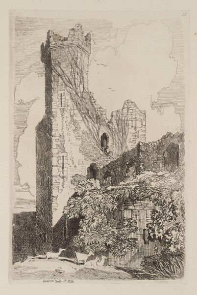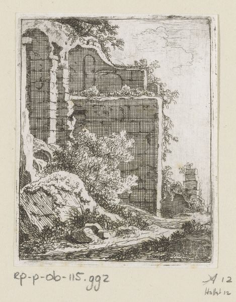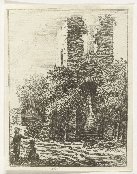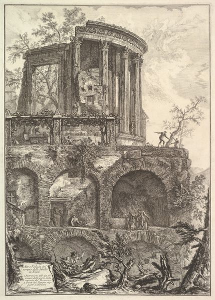 Editor: Here we have Franz Edmund Weirotter's "The Old Palace at Tivoli," an etching from around 1764. It’s a cityscape dominated by the skeletal remains of a grand structure, and what strikes me is the stark contrast between the imposing ruin and the small, almost anecdotal, figures at the bottom. What grabs your attention? Curator: It's interesting how Weirotter uses etching to explore the relationship between labor, material degradation, and romantic ruin. Look at the meticulous lines; they painstakingly recreate the texture of decaying stone and overgrown foliage. It invites us to consider not just the aesthetics of the ruin, but also the processes of material decay, the weathering that collapses civilizations. Consider how the etched lines *themselves* mimic that erosion. How do you think the choice of printmaking – a method of reproduction – adds to this dialogue about material and production? Editor: That’s a great point! Because prints are inherently reproducible, does Weirotter use the process to hint at cycles of construction and destruction, similar to how labor and resources enable both? Curator: Precisely! And look at the architecture—it's a constant interplay between constructed space and natural reclamation. Note the marks of tools and hands long since gone that testify to both the physical effort of construction but now is an admission that they inevitably return to raw matter. Is Weirotter critiquing or lamenting that truth? Editor: I hadn't considered the piece as a comment on cycles, but that reframes the people within it; perhaps it subtly references the enduring role of human labor in those grander schemes. Thank you for this, the materiality is actually telling a much bigger story! Curator: And hopefully, it shows that even what seems to be a picturesque scene hides a network of social and material forces. Food for thought.