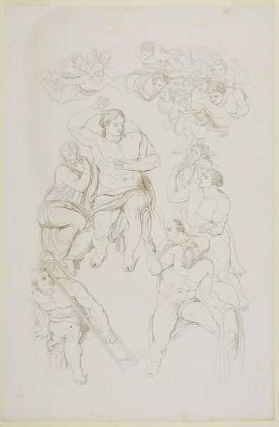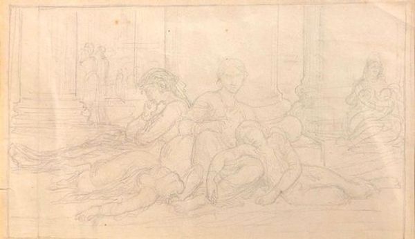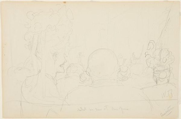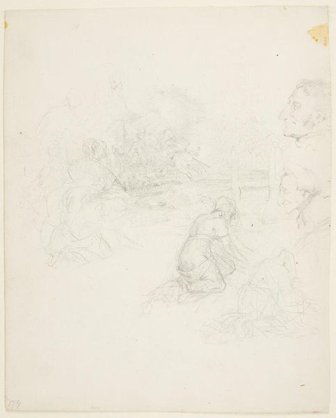 Editor: So, this is Felix Octavius Carr Darley's "Ichabod Crane Tells His Tales at the Fireside." It’s a delicate chine collé print. It almost feels like looking at a ghost story, with the pale lines sketching out the scene. What do you make of it? Curator: It reminds me of half-remembered stories whispered in the dark. Darley captures that liminal space between reality and imagination. The unfinished quality echoes the way tales evolve and change each time they're told, don't you think? Editor: That's a lovely way to put it! The sketchiness really amplifies the storytelling aspect. Curator: Exactly. It’s less about a precise image and more about the transmission of folklore, the very act of sharing spooky tales around the fire. You can almost hear Ichabod's voice weaving its spell! Editor: I never thought about art capturing sound before. Curator: It's all about that sensory experience, isn’t it? A visual echo of a shared moment in time.