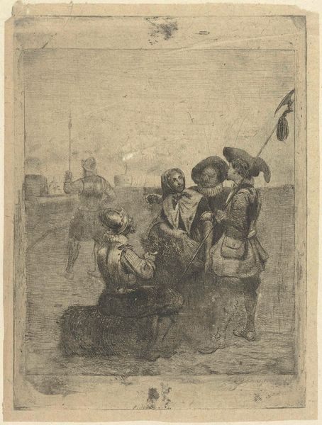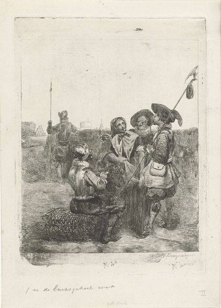 Curator: This is Reinier Craeyvanger's "Soldaten met een jong meisje", or "Soldiers with a Young Girl," an etching, made sometime between 1822 and 1880, now residing at the Rijksmuseum. I’m immediately drawn to its delicate lines and sense of everyday life—it’s almost photographic in its realism. How do you interpret this work? Editor: The details achieved through etching, the figures are highly engaging. There’s something charming in the depiction of genre, what are some of the key visual aspects of the composition? Curator: Indeed. Focusing on the formal elements, note how the artist uses contrasting textures – the smooth armor against the woven basket, for example – to create visual interest. Consider how the figures are arranged in a triangular composition, drawing your eye to the group. Notice the orthogonals created by their spears in the top and lower plane of soldiers to hold it together. How do those details contribute to the overall mood? Editor: That arrangement definitely adds to a sense of stability. And those textures make it more tangible, believable. It seems a kind of study of line quality: precise for edges but scribbled within the subjects, to communicate something lively. But what would this have meant to contemporary viewers? Curator: To understand that, we must remain grounded in visual evidence. The details within the lines reveal their costumes, postures. Note the young girl offers flowers to the solder. A scene like this could imply that their exchange is mutually beneficial for them both. It could further invite us to ponder their potential emotional state while exchanging these objects. This perspective shows how careful formal observation opens onto broader social questions. What's your take after observing some of its subtleties? Editor: Interesting perspective; I never noticed how composition brings stability. Thanks!