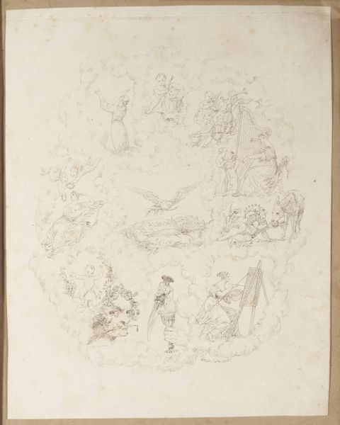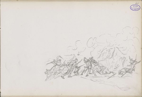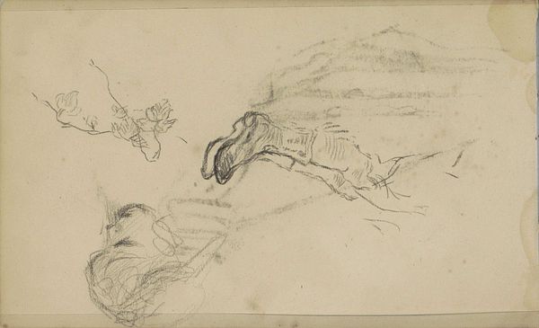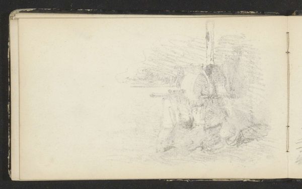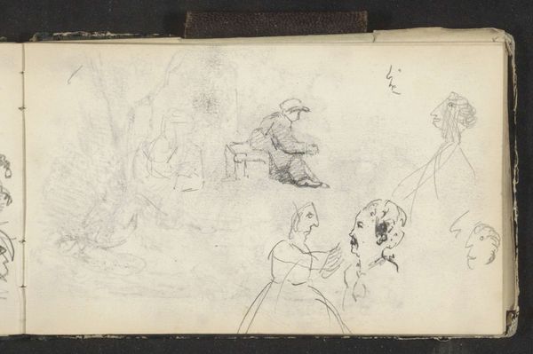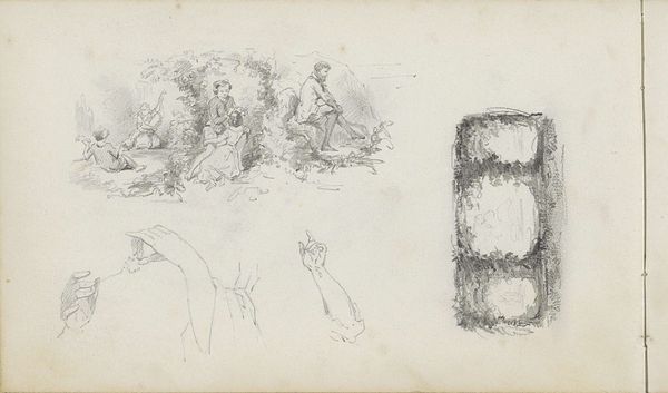 Curator: Here we have a page from the sketchbook of Johannes Tavenraat, titled "Landschap met twee mannen en één vrouw te paard," created sometime between 1833 and 1841. Editor: Immediately, I'm struck by the dynamism, the sheer energy captured with these light pencil strokes. It feels like a fleeting moment preserved. Curator: Tavenraat, though not a household name today, was part of the Romantic movement, a period deeply invested in nature, emotion, and the individual experience. We see that romanticism alive in these images of figures within the landscape. Editor: The use of toned paper is quite effective. It gives an instant depth, creating light and shadow with minimal marks. Look how the figures on horseback command the page's foreground with their relative size. Curator: This sketch offers an intimate glimpse into the world of Dutch gentry. Sketchbooks, becoming popular around this time, were status symbols reflecting leisure time. Imagine what their social lives could be when viewing this! Editor: Yet, despite the apparent spontaneity, there's a clear compositional awareness. The figures, positioned on the left balance those dead animal sketches on the right, their gaze draws us into the open space around them. Curator: Consider this in relation to ideas around land ownership at that time. We can note this subtle commentary about this leisure. But the overall narrative, a romantic view of pastoral life, is certainly at play here. Editor: Perhaps, but the incompleteness hints at the limitations of that very view. It's almost as if Tavenraat is presenting us a study. With different figures across a canvas. Curator: The sketch resides here at the Rijksmuseum, allowing us a precious peek at both the artist and this society's aspirations. Editor: Exactly. This small sketch invites viewers to complete the narrative, inviting all viewers in to feel what it means to connect to an unfinished beauty.