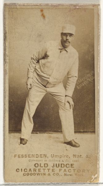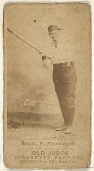 Goodwin & Company created this photomechanical print of Jake Kilrain as part of the Celebrities and Prizefighters series for Old Judge Cigarettes. The sepia tone flattens the subject into a pattern of light and dark, emphasizing the contrast between Kilrain's pale torso and dark tights. The composition divides the image into a structured arrangement, Kilrain's figure positioned dynamically, the diagonal lines of his arms lead the viewer's eye across the frame, creating a sense of movement within the static medium. Note the symmetry of his stance, which provides a stable base for the implied action. This card operates as a sign, simultaneously promoting a product and celebrating a public figure. Through the semiotic interplay of image and text, the card encourages a cultural dialogue about celebrity, athleticism, and consumerism. The photograph invites us to consider how the body becomes a site of spectacle and commerce. The structured composition and sepia tones contribute to a visual language that transcends mere representation, inviting ongoing interpretation.