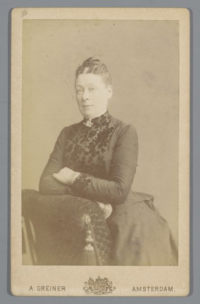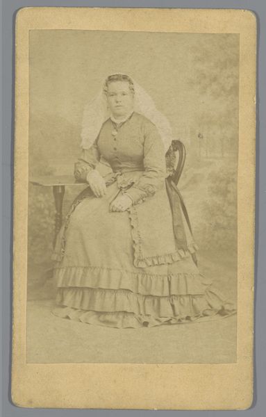 This is a portrait of Remmetje Bachman, made by P. Siewers & Zoon using photographic methods. The image is small, only about 10 centimeters in length, a size that speaks to its function as a personal keepsake or calling card. The sepia tone gives the photograph a sense of warmth and nostalgia. It's a direct result of the chemical processes used to develop the image, where silver particles react to light and create a tonal range. Look at the details: the lace of her bonnet, the texture of her dress. These are captured with surprising clarity, showing how photography democratized portraiture. Before photography, portraits were the domain of the wealthy, but with this technology, people from a wider range of social classes could have their images preserved. The labor involved has shifted from the artist's hand to a more technical process, but it still requires skill and care to produce a compelling image. It reminds us that even in the age of mechanical reproduction, the human element remains crucial.