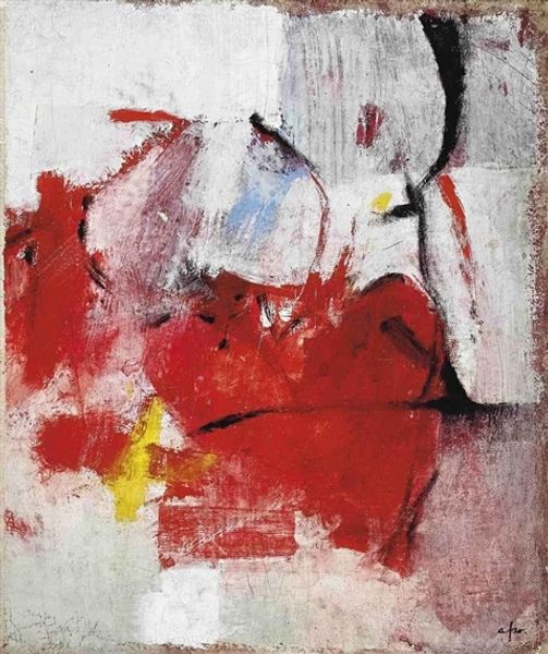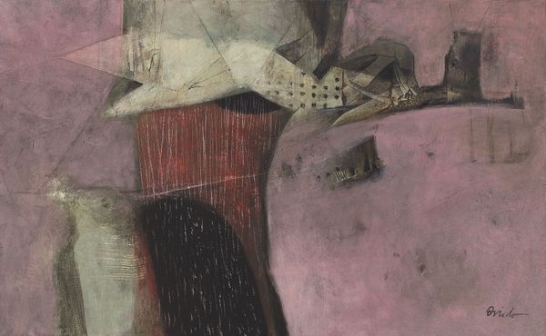 Editor: This is Mark Rothko's "Untitled (woman with sculpture)," painted in oil sometime between 1934 and 1935. It’s a somewhat unsettling image. The palette feels muted, the woman looks like a statue herself. What strikes you when you look at it? Curator: Immediately, I note the interplay of forms and the deliberate ambiguity fostered through Rothko's simplification of shape. Consider the relationship between the sculpted forms and the woman's figure. Notice how they seem to echo each other, particularly in their upward gazes and attenuated limbs. Are they distinct entities or part of the same aesthetic problem Rothko is exploring? Editor: That’s a good question, the echoing does bring up interesting interpretations! I hadn’t really noticed it at first but now I see the lines are very similar. I suppose I was thrown off by the flat use of colour. The woman is a figure, whereas the sculptures are simply…grey. Does that signify a difference? Curator: The tonality does play a key role. Is it about the stark contrast between the artificial and the natural, or does it lead towards a discourse about flatness versus volume? Ask yourself what visual cues suggest to the eye that there is more depth in certain spaces of this artwork? Editor: The composition definitely leads you to consider those spaces – the angles, too. And actually, although they’re simplified forms, they're positioned within a clearly defined—though not fully realised—space. So, Rothko isn't abandoning representation entirely. Curator: Precisely. We observe how the painting mediates figuration with the nascent exploration of pure abstraction which later became Rothko's hallmark. Notice the way the planes of colour intersect, defining volume and space, even while denying it through the flattened perspective. The painting serves as a fascinating node in Rothko’s larger aesthetic journey. Editor: Yes! Looking at this now, it's like seeing the seed of what was to come, while being its own intriguing piece. The painting suddenly feels charged with Rothko's explorations and it also speaks to his greater body of work.
