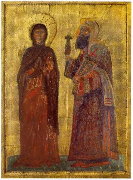 This is the Annunciation of Ustyug, an orthodox icon found here in the Tretyakov Gallery. Orthodox icons have a rich history, traditionally serving as visual theologies, deeply embedded in the spiritual and cultural life of those who view them. This piece captures the moment when the Angel Gabriel informs Mary that she will conceive and bear the son of God. The depiction of Mary here isn't just a portrayal of a divine messenger's encounter with a virgin; it’s a complex intersection of gender, divinity, and destiny. The icon invites viewers to contemplate the courage, faith, and submission embodied by Mary in accepting her role. Her emotional state seems suspended between awe and acceptance. Icons like this shaped the spiritual identities of countless individuals, offering a focal point for prayer. This image still resonates today, inviting us to consider the profound implications of choice, faith, and the intersection of the human and divine.