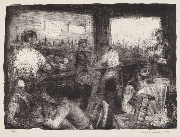 Editor: This lithograph is called "Dressing Room" by Zsuzsi Roboz. The medium looks so tactile, almost like charcoal, which makes the scene feel very immediate and intimate. What strikes you about the process and materials? Curator: The lithographic process itself is fascinating. The use of a stone matrix and greasy crayon creates a rich, almost velvety texture, mimicking the intimacy of the dressing room. Consider the labour involved: grinding the stone, creating the image, proofing, and finally, the printing itself. How does this labour influence our understanding of the final image? Editor: It's almost like a performance in itself, far removed from our digital age! Curator: Precisely. And think of the social context. Dressing rooms are spaces of transition, often associated with performance and identity. Roboz's choice of lithography, a more accessible printmaking method, democratizes this intimate scene, offering it to a wider audience for consumption and contemplation. Does it challenge the traditional boundaries between high art and everyday life? Editor: Absolutely, this makes me see "Dressing Room" with fresh eyes, appreciating both the artist's labor and its wider cultural context. Curator: Indeed, by focusing on the materiality and production, we gain a deeper understanding of the artwork's meaning and impact.