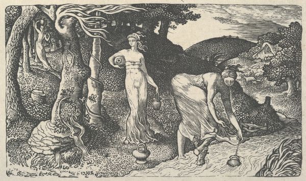 William Blake made *The Man Sweeping the Interpreter's Parlor* using etching, a printmaking technique in which acid is used to cut into a metal plate, which is then inked and printed. Look closely, and you'll see how Blake uses the etched lines to create a sense of depth and texture. The sweeping figure, possibly a devil, is rendered with strong, dark lines, giving him a powerful, muscular presence. The angel on the left, by contrast, is drawn with finer, more delicate lines, emphasizing her ethereal quality. The material effect achieved by the etching process adds to the thematic contrast between good and evil. Blake’s choice of etching is significant. Unlike painting, which was seen as a fine art, printmaking was more closely associated with craft and the production of books, though Blake used it in a highly individual, visionary way. The labor-intensive process reflects the hard work of both the sweeper in the image and the artist himself. By using this medium, Blake elevates the status of labor and challenges conventional hierarchies within the art world.