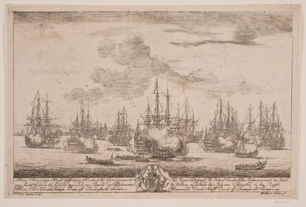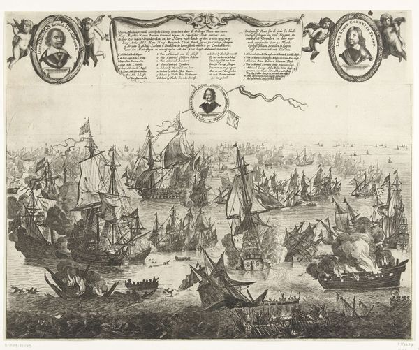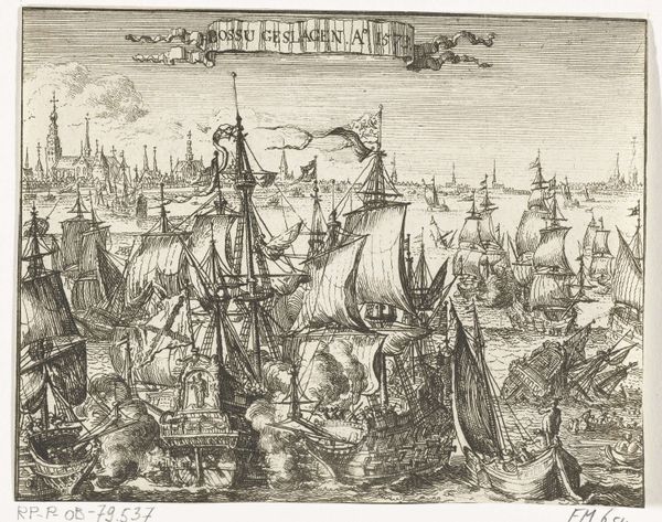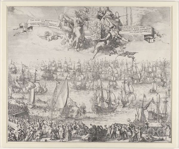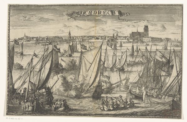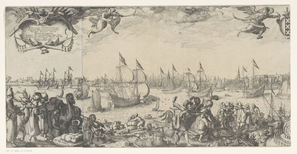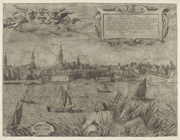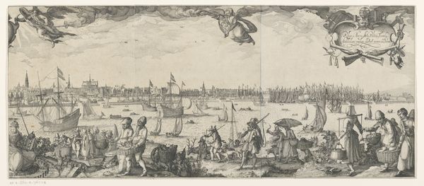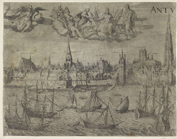 Curator: This detailed engraving presents a panoramic view of Antwerp as seen from the Scheldt river, placing the viewer among a flotilla of impressive sailing vessels. This print, "Antwerpen van de Schelde te zien, linker blad," likely dates sometime between 1617 and 1667, created by an anonymous artist during Antwerp’s Baroque period. Editor: Immediately, my eye is drawn to the contrast between the dynamic, almost churning water and the more static, solid cityscape. The ships almost seem to be straining against the current to reach the orderly architecture behind them. Curator: That tension really speaks to Antwerp’s identity at the time. As a major port city, it was economically powered by that flow of goods and people represented by those ships. The architecture symbolizes the established power structures that depended upon that commerce. The upper left shows what appears to be text in Latin; above the skyline we can see two cherubic figures, seemingly in reverence. Editor: Indeed! Angels, ships, and Latin text - Antwerp seems to be very intent on presenting a certain idea of itself to the world. Note also the prominence of the ships' flags. Those visual elements lend the entire scene an air of divine right to international trade. This kind of self-aggrandizing imagery was essential to projecting power and solidifying its influence in trade and politics at the time. Curator: Exactly, engravings such as these also played a role in shaping Antwerp’s urban identity, projecting a sense of civic pride and cultural authority. And the relatively wide distribution of prints ensured that a larger populace felt implicated in these visual representations. What do you make of the windmills atop the cityscape? Editor: Windmills are fascinating. In art, they frequently function as emblems of industry, transformation, and sometimes, resilience. Given their placement within a bustling port city, these windmills might represent Antwerp's commitment to technological progress, specifically harnessing natural resources. And on another level, perhaps, they serve as a subtle reminder that Antwerp’s prosperity is intertwined with constant effort and resourcefulness. Curator: This image, rendered with great care and impressive technique, reminds us that urban views are always constructed. The image is very aware of its purpose and impact, meant to inform the world and persuade. Editor: And for viewers today, understanding the layering of intent encoded in images allows us a greater sense of continuity and deep memory. The push and pull of forces that shaped Antwerp centuries ago are visible, almost tangible.
