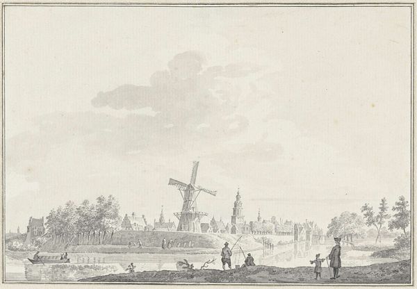 Editor: Here we have Hendrik Spilman’s “Gezicht op Montfoort,” an engraving made sometime between 1744 and 1784. I find the scene so tranquil and almost idealized. The composition seems very carefully arranged, with the town nestled between water and sky. What can you tell us about it? Curator: Well, what strikes me is the visual vocabulary Spilman employs and what that reveals about the public perception of landscape at that time. The picturesque aesthetic was gaining popularity, and we see that here: the windmill, the church spire, the leisurely figures on the water, all carefully placed to evoke a sense of harmony and prosperity. How does this image function in an emerging print market? Editor: I see your point about it being "carefully placed." It doesn’t feel particularly candid. What was the demand for these types of prints at the time? Was it purely aesthetic, or did it have some other purpose? Curator: Excellent question. Consider that this engraving likely served a didactic function. These cityscapes were often commissioned by civic authorities, celebrating their urban development, reinforcing ideas of Dutch identity, and boosting civic pride. Look how prominent the Willekopper Poort is; that served a dual function. This visual rhetoric also bolstered the social and economic standing of the Dutch Republic. To what extent did these idealized images shape people’s perceptions of their own society? Editor: That's fascinating; so it’s not just a pretty picture; it's a carefully constructed message! It makes me wonder how accurate these depictions were, and what details were perhaps…conveniently omitted? Curator: Exactly! The absences can be as telling as the presences. It invites us to investigate other records: archival documents, trade records, and even maps to understand the full context. Editor: I’ll never look at a cityscape the same way again. Curator: Nor will I.