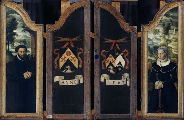 Curator: So, here we have what's known as a "Grafbord," or memorial panel, commemorating George Lodewijk Vernet, who directed Bengal from 1763 to 1769. It's dated after his death in 1775. Editor: Right off, it feels weighty, serious... and oddly captivating. Is that a painted wooden board? It has that almost aged quality, the kind of piece that tells a quiet story. Curator: Indeed. The materials list "painting" and "wood," placing it firmly in the tradition of Dutch Golden Age and Baroque memorial art. We have these panels in memory of notable individuals. Given Vernet's role with the Dutch East India Company, it really anchors him to the economic and political complexities of the period. Editor: Bengal! Batavia! So evocative of trade routes, colonial power, lives lived across continents. And the coat of arms, that splash of crimson and gold. A star and crescent—very intriguing imagery in a European context. Almost exotic. Curator: Exactly. Heraldry became incredibly important for establishing identity and social standing. A board like this in the church would be visible for all to recognize family and social status, linking Vernet’s personal identity to the wider narratives of colonialism and global commerce. The details really underline intersectional relations between Europe and Asia during that period. Editor: Thinking about his legacy now though… how does a symbol like that hold up, knowing what we do about colonial rule? I guess, even in remembrance, the art’s inseparable from all those complex layers, good and bad, and mostly bad. Curator: Precisely, by putting his achievements on display, this Grafbord essentially sanitizes some exploitative activity. The text and iconography construct him as this great man, glossing over some inconvenient truths. Looking at this piece encourages us to consider ethical considerations that should inform our examination and comprehension of art within its complex historical circumstances. Editor: Hmm. Definitely gives me more to ponder than just a face from a long time ago. Like a little painted portal to bigger questions... good reminder that every single gilded thing casts a shadow.