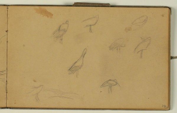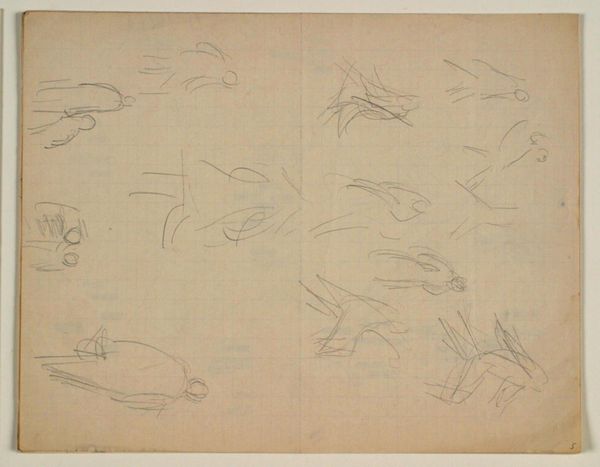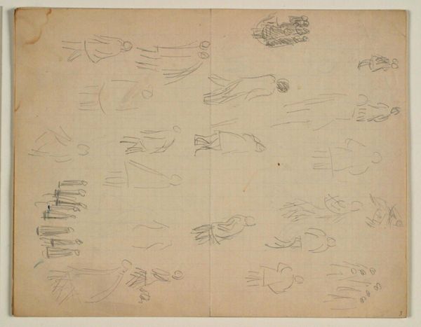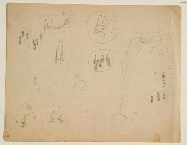 This drawing, made by Niels Larsen Stevns, explores figures in motion using graphite on paper. The lightness of the graphite allows for quick, almost ephemeral marks, capturing fleeting gestures and poses. The choice of material is crucial here; graphite, easily erasable, suggests a process of trial and error, of capturing movement as it unfolds rather than freezing it in a static form. The texture of the paper, though subtle, also plays a role, offering a slight resistance to the graphite, influencing the quality of the lines. You can see a multitude of figures that almost give the impression of sequential movement, like that of early motion picture experiments. It reflects a focus on process and experimentation over the final, polished product. By valuing these 'working drawings' as artworks in their own right, we challenge traditional hierarchies between sketch and finished piece, highlighting the value of process, and the labor of artistic exploration.
