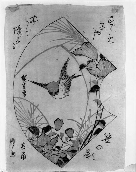 Editor: This woodblock print by Katsushika Taito II, from "Kacho Gaden," features two birds and maple leaves in delicate lines and soft colors. It feels very peaceful. How do you interpret the relationship between the birds and the leaves, and what cultural significance might this imagery hold? Curator: The pairing of birds and maple leaves, often symbolic of autumn, invites a deeper exploration of its historical context. Consider the artist’s position within a lineage, inheriting and perhaps subverting traditional modes of representation. How might we read the passivity of these birds in relation to societal expectations and constraints placed upon artists of the time? Editor: That's a really interesting perspective. I hadn't thought about the artist's position in society influencing the composition. Curator: Exactly! By questioning whose perspectives are privileged within art history, we can uncover layers of meaning and challenge conventional narratives. Editor: I'll definitely keep that in mind. Thanks! Curator: Remember, art is never neutral. It always speaks from a specific historical, social, and political position.
