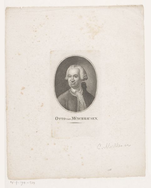 Curator: My first impression is one of almost austere refinement, and there's something deeply romantic about it too, wouldn't you agree? Like a lost verse from a Jane Austen novel. Editor: You know I do! And speaking of Austen, this is a portrait of Gottlieb Conrad Pfeffel. Friedrich Wilhelm Bollinger created this engraving sometime between 1818 and 1832. It is housed right here at the Rijksmuseum, and represents the Neoclassical style. Curator: The realism of his gaze, though! It’s as though he’s sizing me up, trying to decipher my deepest secrets. All with a detached elegance that suggests he’s seen it all before. Editor: Absolutely. The neoclassical style often emphasized clarity, order, and restraint. It’s interesting to consider that Pfeffel lived during a period of immense social and political upheaval, straddling the Enlightenment and the rise of nationalism. How might that tension manifest itself? Curator: I wonder if the octagonal frame isn't some nod towards that restrained rigidity too? It is such a different way of thinking about 'framing' your own image in the world; choosing restraint over ornate drama feels really powerful in hindsight. I can just picture him refusing the powdered wig, and instead opting for a sleeked-back style. What a rebel! Editor: He’s presenting himself in a very specific way. But also, notice the artist's choice of engraving and etching rather than painting—less immediate than oil. Think of it as almost performative: what are they attempting to express or perhaps even conceal about Pfeffel? What ideological work is being performed? Curator: Yes, but don't let that serious stare trick you; those engravers have a lot of romantic whimsy and I feel they truly wanted to offer their perspective about the era. Even in such carefully planned portraits you get the touch of their dreams and nightmares as artists, it really speaks to me! Editor: You're right, that delicate touch, the precision—there's a real human presence amidst all the order. This makes the piece even richer when considering the broader context of that era. Curator: To encounter this work of art is a delicate invitation into history! Editor: I agree; there is always an invitation, if we are willing to answer.