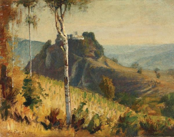 Curator: The tranquil surface and loose brushwork initially give me the impression of a faded dreamscape. Editor: Well, let's pull it into focus then. Here we have Charles François Daubigny's "Landscape near Villerville," painted in 1873. He employed oil paint, directly en plein air. Curator: The canvas breathes with an interesting juxtaposition of broad and deliberate brushstrokes, structuring an almost classically picturesque scene. The horizontal composition, split roughly in thirds, draws attention. Can you talk about this location, perhaps? Editor: Villerville, on the coast of Normandy, offered Daubigny access to both pastoral and marine subjects. And what we observe in terms of materials gives real clues here. I see paint thickly applied, almost sculptural, especially in the trees and foliage. The material weight grounds the whole vision. Curator: Yes, the facture, or working of paint, brings depth, animating an otherwise understated picture. Light seems diffused evenly; note how this elevates mood and blurs a clear perspectival hierarchy. Is there an intent here to democratize or perhaps subvert conventional landscape painting? Editor: I would venture to say absolutely. We have to remember the context, too: the rise of industrialization, mass production—these shaped the art world of Daubigny's time, encouraging painters to directly address their changing environment and working methods. Think of the pigments he employed; they too tell a story of an emergent chemistry industry providing artists vibrant color options. Curator: Ultimately the visual structure succeeds. What appears like pure surface observation has cleverly intertwined pictorial organization that delivers us to sublime depths of form. It is almost representational but its value lies elsewhere. Editor: Indeed, a landscape shaped by its social fabric. An output as it were from hands of labour transforming raw pigment and canvas into commodities that speak across time to reveal the relationship with what’s visible. Curator: A perfect balance has been maintained between structure and the ethereal to elevate this composition beyond being an exercise. Editor: The landscape of labor, presented with palpable strokes.
