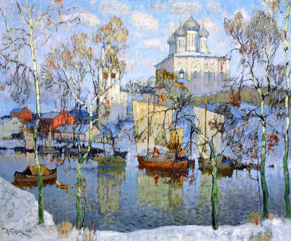 Konstantin Gorbatov made this painting of Pskov, in winter, probably with oils. The way he builds up the colours in soft layers, almost like watercolour washes, makes me think of artmaking as a process of feeling things out. The material qualities of the painting are really important. The texture is smooth, like a memory that's been polished over time. The whites aren't just white; they're mixed with blues and yellows, creating a sense of light and depth. Look at the rooftops, how the snow sits heavy, but also seems to drip and melt. It's so evocative. This attention to the material—the thickness of the paint, the way the brushstrokes catch the light—shapes my emotional experience of the piece. Gorbatov's work reminds me a little bit of Childe Hassam, another painter who was great at capturing the light and mood of a particular place. But Gorbatov has a unique voice, one that embraces ambiguity and multiple interpretations.