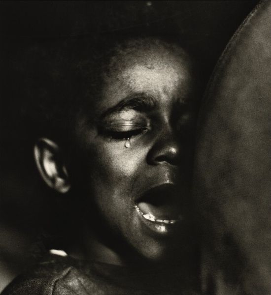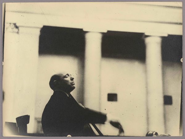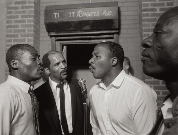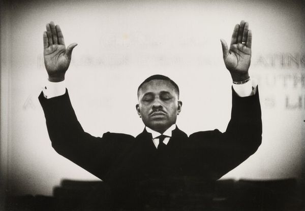 Curator: Immediately, I'm struck by the dynamism of the image; the upward thrust is compelling. Editor: Indeed. We're looking at "Untitled" from the *Storefront Churches series*, captured by Milton Rogovin between 1958 and 1961, using gelatin silver print. Rogovin's work here transcends mere photography; it encapsulates the spirit of these places. Curator: The raised arm, a classic gesture – is it beckoning, praising, or perhaps a symbol of resilience, a fist defying gravity? The monochrome enhances the stark contrast between light and shadow. Editor: The symbol of the hand reaches back millennia, imbued with cultural and spiritual weight; consider, also, the religious context of Rogovin's chosen subject matter. I’d suggest here the hand offers salvation to members. The man, captured mid-speech, evokes an urgency, and it captures something of the sacred ritual in the everyday experience of a congregation, wouldn't you say? Curator: Semiotically speaking, Rogovin uses framing and composition to emphasize a dynamic presence, he invites our gaze to follow the figure, whose black skin takes the light perfectly and whose whited teeth are highly effective against his skin. We should think carefully about the message. This series offers more than documentary evidence. Editor: I agree. Rogovin wasn't merely documenting; he was participating in and honoring a vital part of urban community life. We observe shared spiritual continuity amid profound social change and perhaps hardship. The "storefront church" becomes a site not only of worship, but of sanctuary, cultural expression, and the passing down of traditions. It's a meeting place where culture is made. Curator: His body language is both contained, but then broken by the expressive energy, something you can see and feel that goes beyond his own presence. The artist makes sure we are very aware of him, a Black man, front and centre, empowered. Editor: Seeing how Rogovin’s picture reframes how a specific culture speaks back is always deeply enriching and reminds me about our shared and sometimes conflicted heritage, captured within one man.