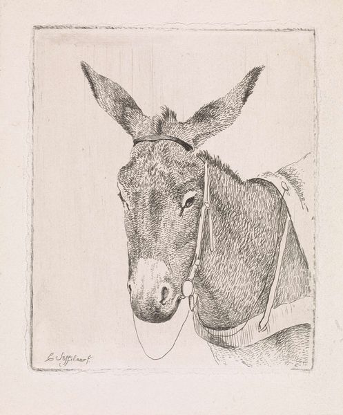 This is a drawing of a donkey’s head, made by Jean Bernard around the turn of the 19th century, using graphite on paper. The artist has focused on the donkey’s face, exploring its texture, weight, and form. It’s a humble medium and a straightforward subject. Drawings like this were often made as studies, and this one may have been preparation for a larger painting or print. You see the artist’s concern with close observation, but also a sensitivity to the animal’s character. The donkey’s downturned mouth and heavy-lidded eyes suggest a burdened existence. At the time this drawing was made, animals like donkeys were crucial to the European economy, providing essential labor in agriculture and transportation. In some ways, this image serves as a reminder of their contribution. By focusing our attention on the artistry and meaning behind this modest graphite drawing, we can move beyond conventional distinctions between fine art and craft.