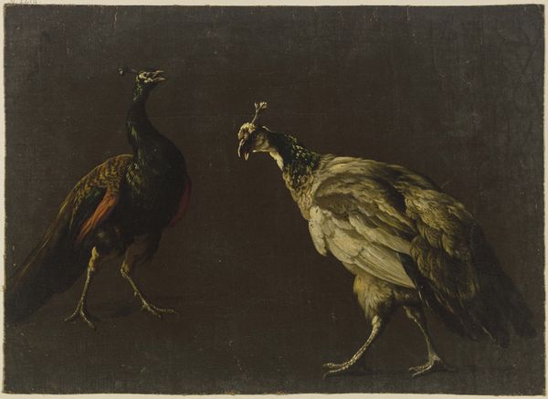 Editor: So, here we have "Farmyard Fowls," an oil painting from around 1827 by John James Audubon. The coloring feels very warm, but there's also something a little unsettling about the rooster's stare. What do you see in this piece? Curator: The rooster does hold a rather commanding presence, doesn't he? Beyond the realistic depiction, consider the symbolic weight of the rooster. Across many cultures, the rooster is linked with vigilance, courage, even resurrection. It is a solar symbol. Notice how Audubon has placed it in a position of dominance, almost guarding the hens and their nest. Editor: So, is he presenting the rooster as a symbol of protection? Curator: Perhaps. Or consider it within the broader context of 19th-century agrarian society. Fowls weren’t merely food; they represented livelihood, domestic stability, the cycle of life. Could Audubon be subtly reflecting anxieties or aspirations connected with these things? What emotional responses do you see embedded in the animals' postures, beyond mere representation? Editor: I hadn't considered that. The hen sitting on the eggs certainly seems calm, self-assured. Curator: Indeed. Look, too, at the darker tones, contrasting with the lighter fowls. Are we presented with ideas about vulnerability versus security? Domesticity contrasted with forces lurking beyond the immediate light? These symbols give shape to what we understand and feel. Editor: I see what you mean. It’s more than just a painting of chickens; it's a loaded image about home and maybe anxieties about keeping that safe. It's fascinating how many layers of meaning are tucked in here. Curator: Precisely. Each time we view it, different associations resonate and re-emerge from our cultural memory.